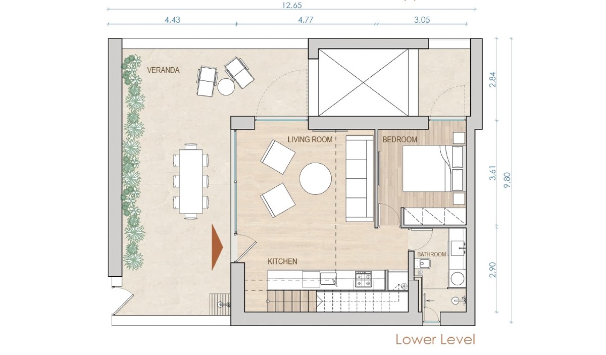 On the lower level is an open plan living, dining and kitchen area, with outdoor access. The outdoor area of this unit is 52,29m2.