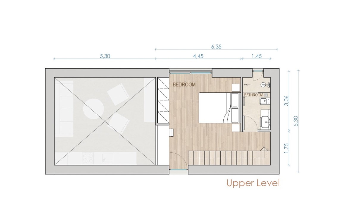 On the lower level is an open plan living, dining and kitchen area, with outdoor access.  Outdoor area for this unit is 32,80m2.